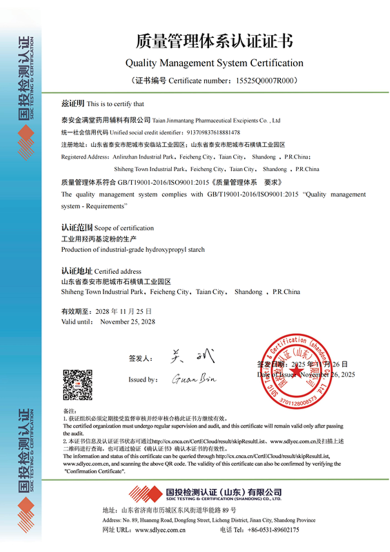 2025年11月26日,我公司羥丙基淀粉順利通過GB/T19001-2016/ISO9001:2015質量管理體系認證。